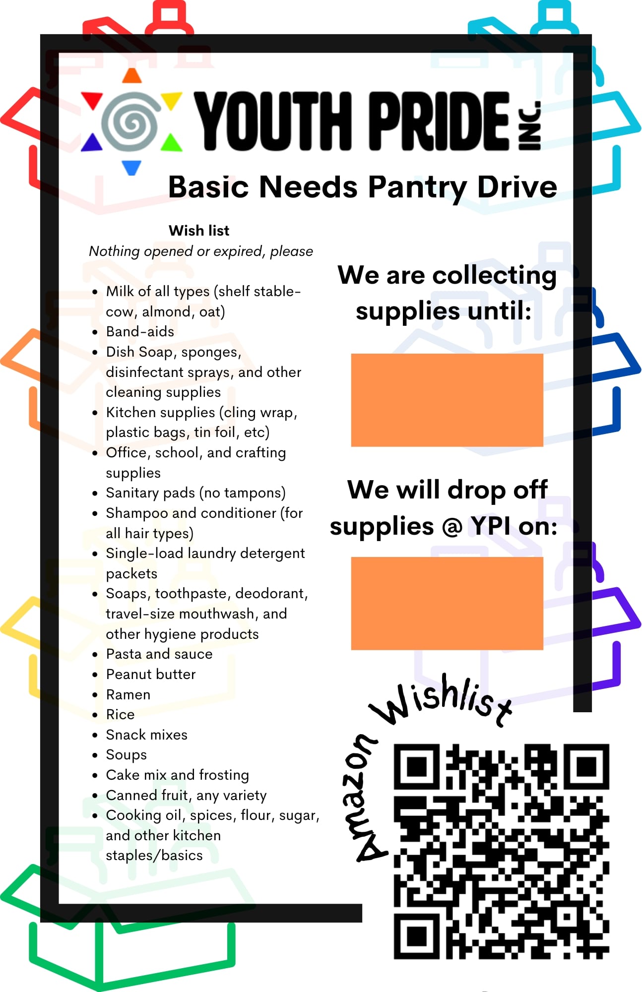 Looking for ideas? Take a look at our Basic Needs Pantry Wishlist for the items we need the most, it also doubles as a Drive poster! We have an Amazon Wishlist to remove the guesswork and save you a car drive, too. You can also donate through our Venmo (YouthPideInc) or PayPal. Thank you for your support!